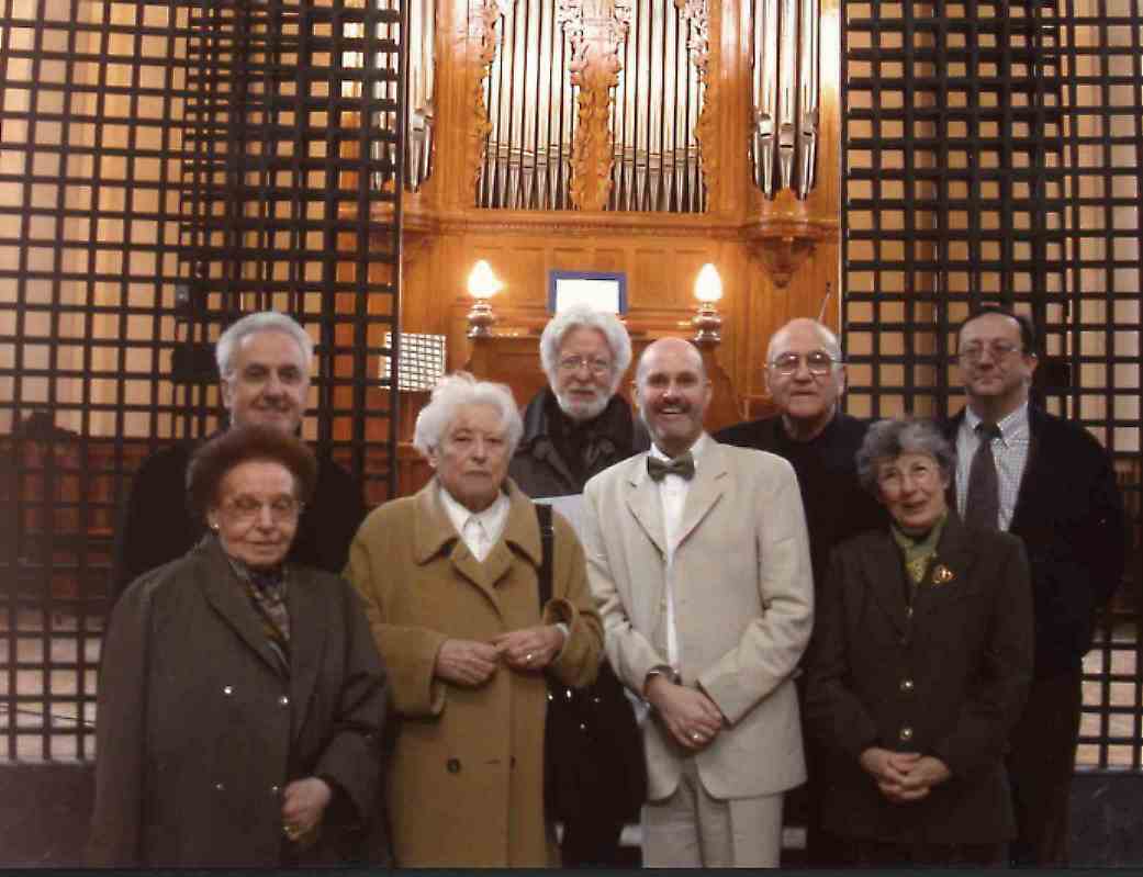 Raphaël Tambyeff, Docteur Sauvé (neveu d'Emile Bourdon), abbé Pierre Gourdon, Hervé Désarbre, Suzanne Chaisemartin, Marie-Louise Girod, Jean-Dominique Pasquet, Nicole Demaledent. Photo prise à l'issue du récital d'orgue -avril 2003- de Jean-Dominique Pasquet, dans le cadre des auditions mensuelles et de l'année des 150 ans de l'orgue du Val-de-Grâce. Aux côtés de Hervé Désarbre, actuel titulaire de l'orgue du Val-de-Grâce, trois de ses prédécesseurs : Nicole Demaledent, Jean-Dominique Pasquet et le Père Gourdon. |